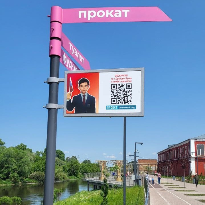 На набережной появился новый указатель с QR-кодом «Карманный гид». На нём специально для жителей и гостей округа обозначен туристический маршрут с мини-видеоэкскурсиями по историческим местам города Орехово-Зуево. Придумал его 7-летний лицеист Денис Рябов, помогали мама-историк и папа- IT-специалист. В некоторых точках с помощью технологий дополненной реальности можно увидеть, как выглядело то или иное место век назад.