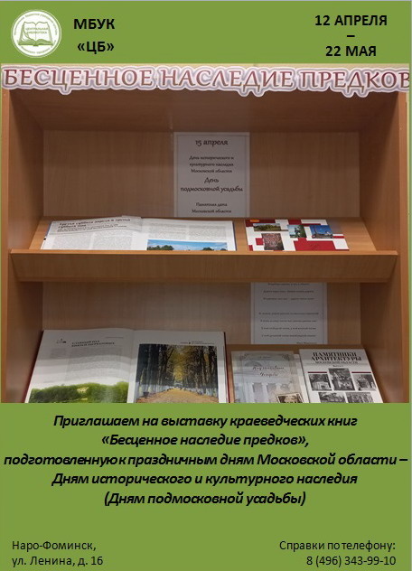 Эти праздничные дни назвали также Днями подмосковной усадьбы. Они призваны обратить внимание «на необходимость сохранения и изучения этого феномена русской культуры, лучшими образцами которого богата земля Подмосковья», – сказано в книге «Праздничные дни и памятные даты Московской области». Эта книга и открывает выставку краеведческих книг «Бесценное наследие предков», подготовленную сотрудниками информационно-библиографического отдела к Дням подмосковной усадьбы.