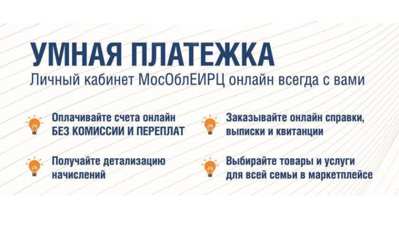 «Умная платежка» – это один из сервисов личного кабинета клиента «МосОблЕИРЦ Онлайн», с помощью которого можно контролировать баланс лицевого счета и историю всех начислений и платежей. При желании счет и документ об оплате можно в любое вре мя скачать и распечатать.