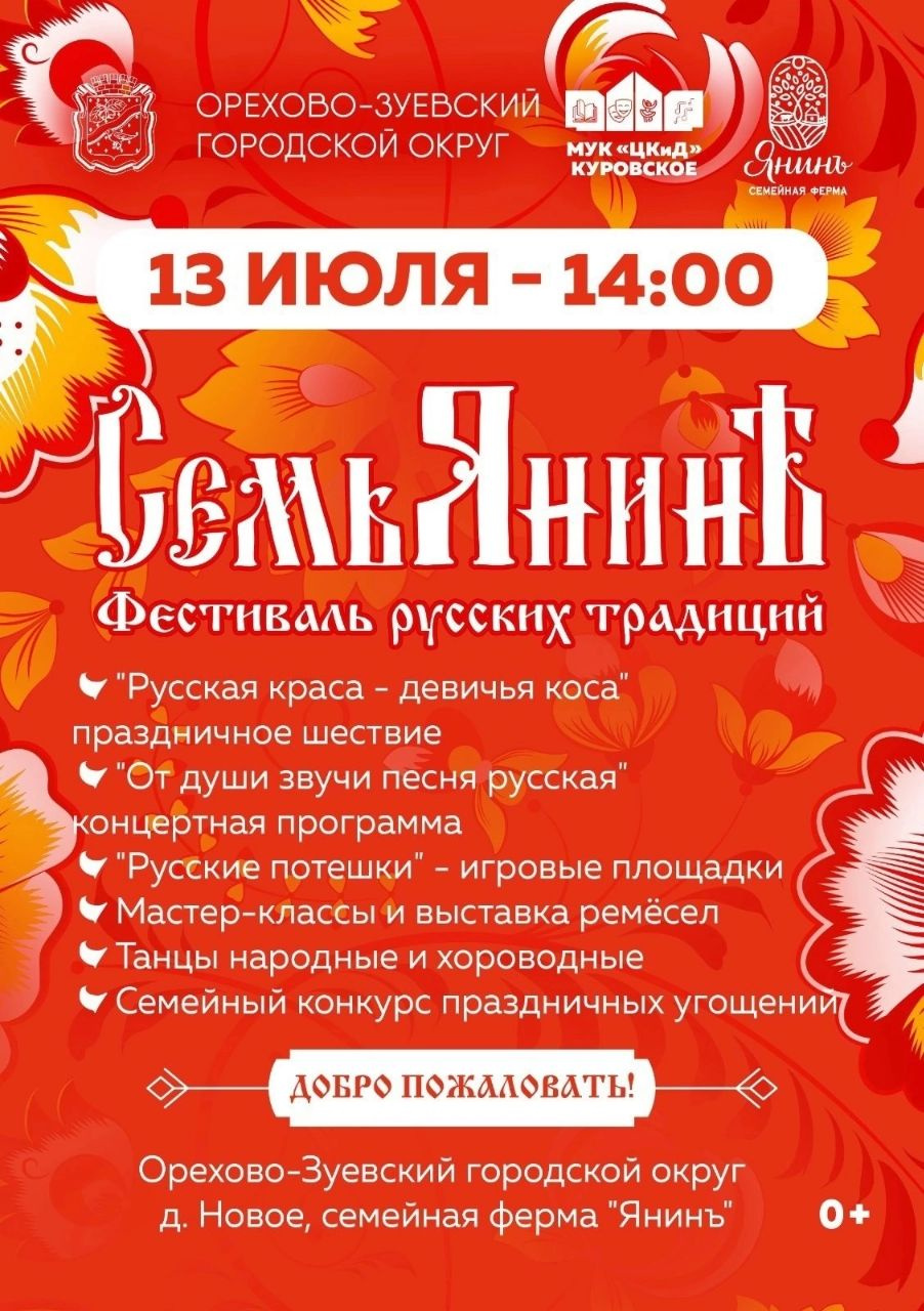 Фестиваль «Семьянинъ» пройдёт в Орехово-Зуевском округе Жителей и гостей округа приглашают на фестиваль русских традиций «Семьянинъ» — праздник, объединяющий увлечения всей семьи от мала до велика!