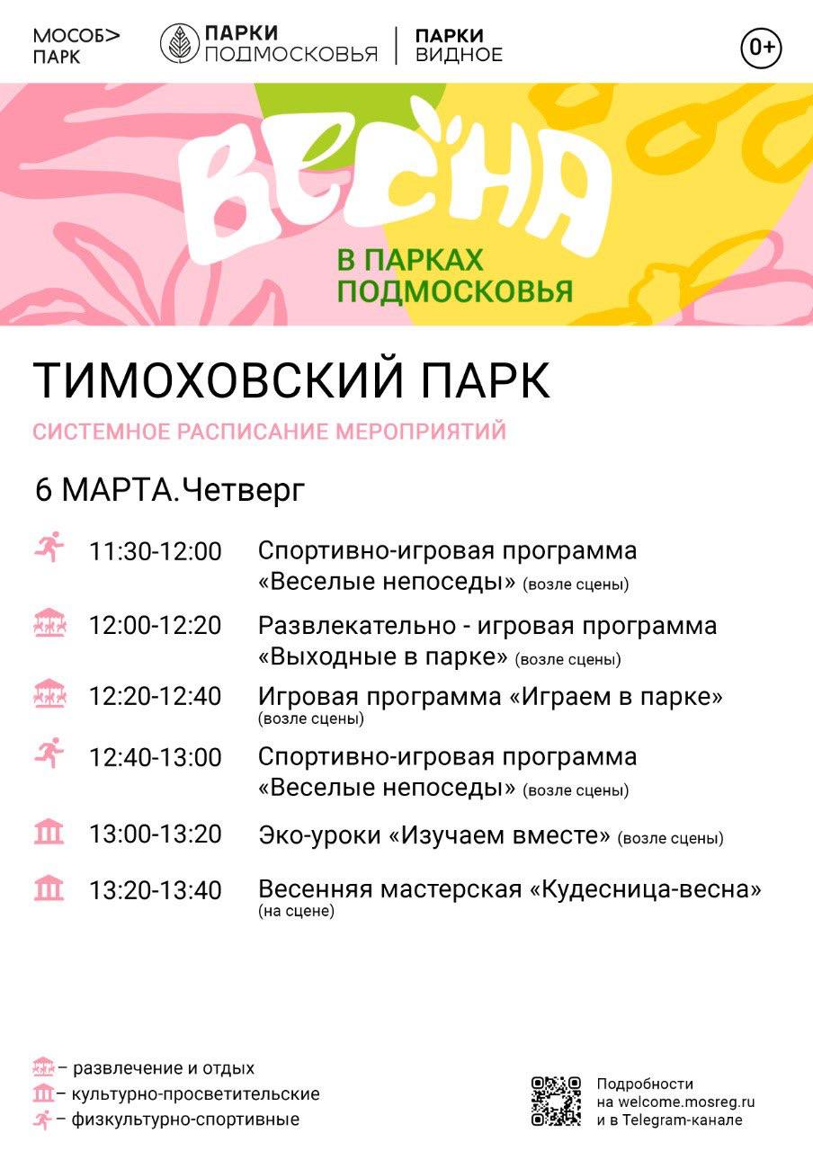 Также 5 марта игровая программа для детей и весенняя мастерская состоятся в лесопарке «Высота». 6 марта в Тимоховском парке пройдут развлекательные мероприятия для ребят, а также эко-уроки и весенняя мастерская, где малыши будут делать поделки своими руками.