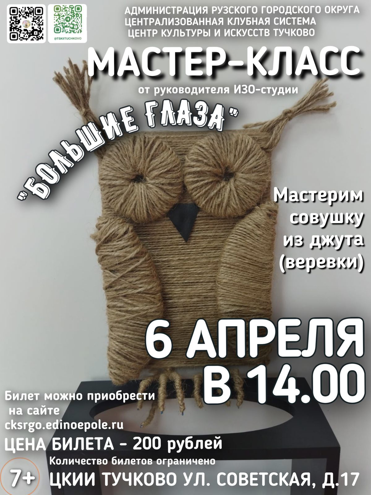 Его проведет руководитель изостудии Галина Пигарева. Участники будут мастерить совушку из джута (веревки).